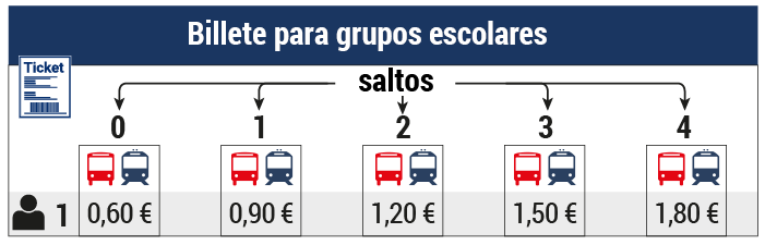 El billete de grupo está específicamente dirigido a los centros escolares adscritos a la consejería competente en materia de educación del Gobierno de las Islas Baleares. Es gratuito para los alumnos de Educación Infantil y Primaria y de Educación Secundaria Obligatoria. Para el resto de enseñanzas, se ofrecen estos precios: